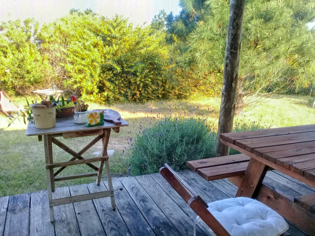La casita verde ofrece además parrillero completo, sillas y reposeras para generar espacios en el exterior, debajo de grandes pinos, o al reparo de la brisa marina cuando el sol cae.