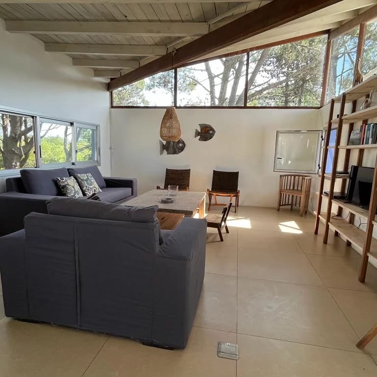 Ubicada entre altos pinos, con vista y a pasos del mar, esta casa de dos plantas ofrece todo lo