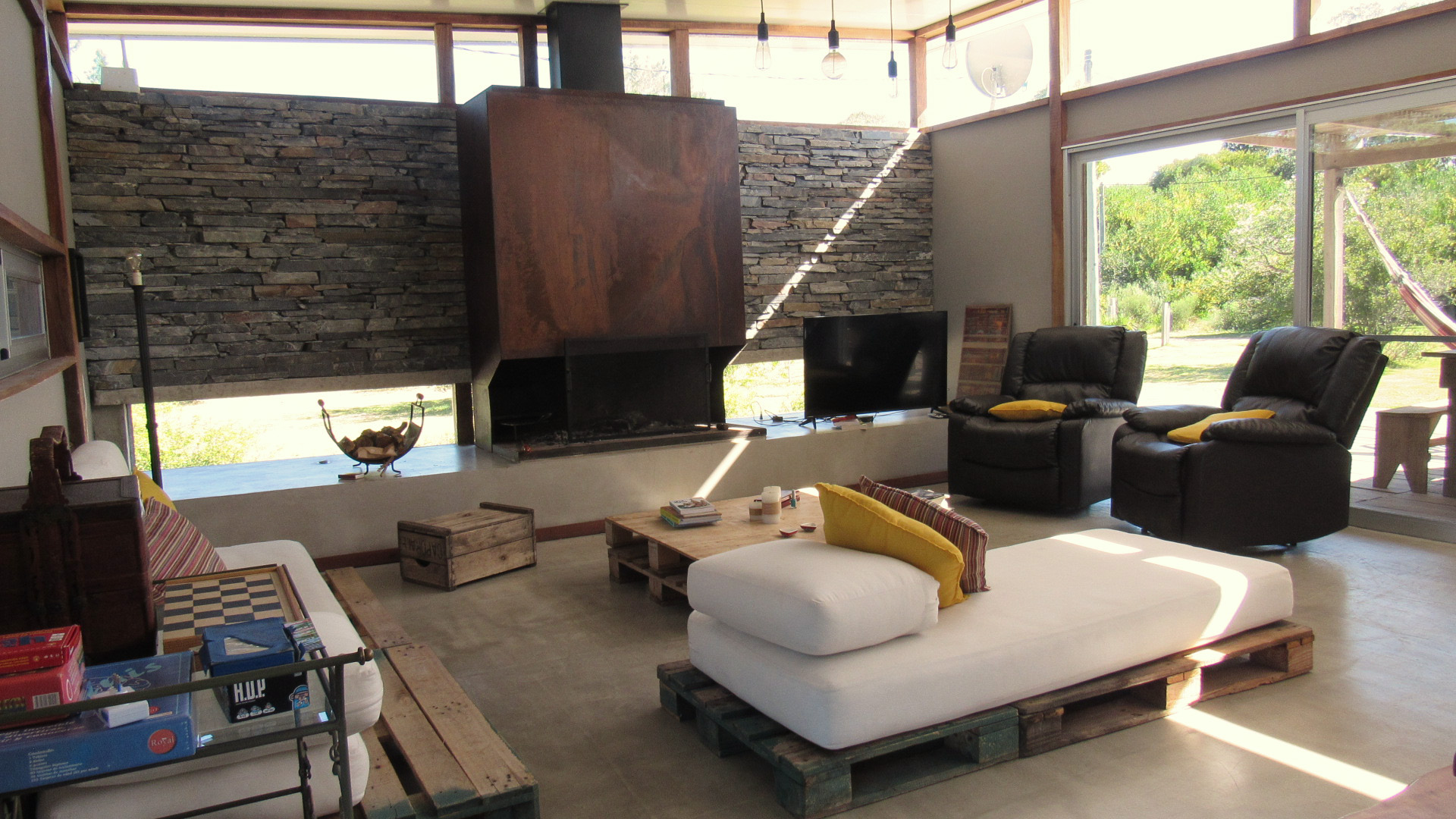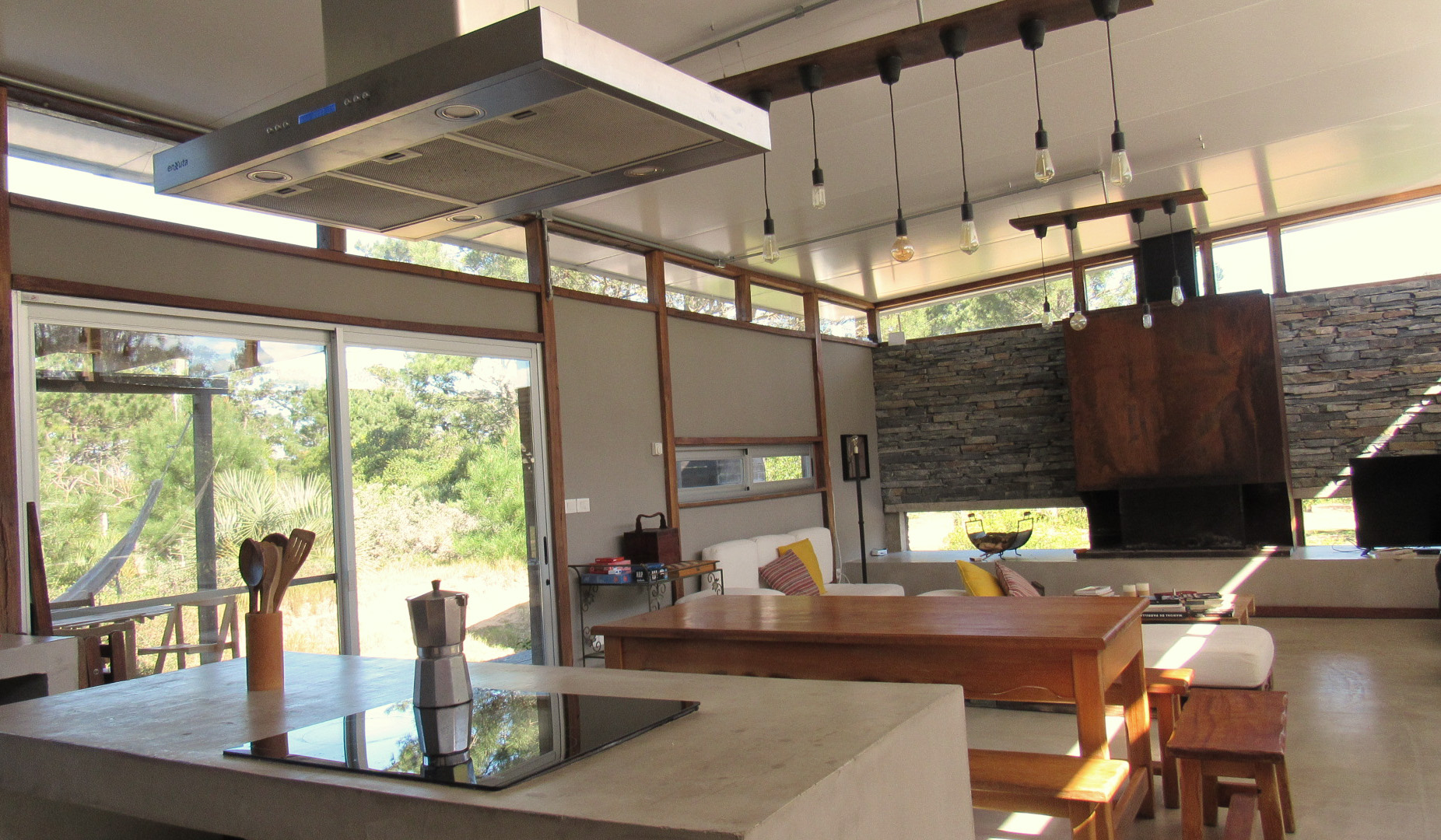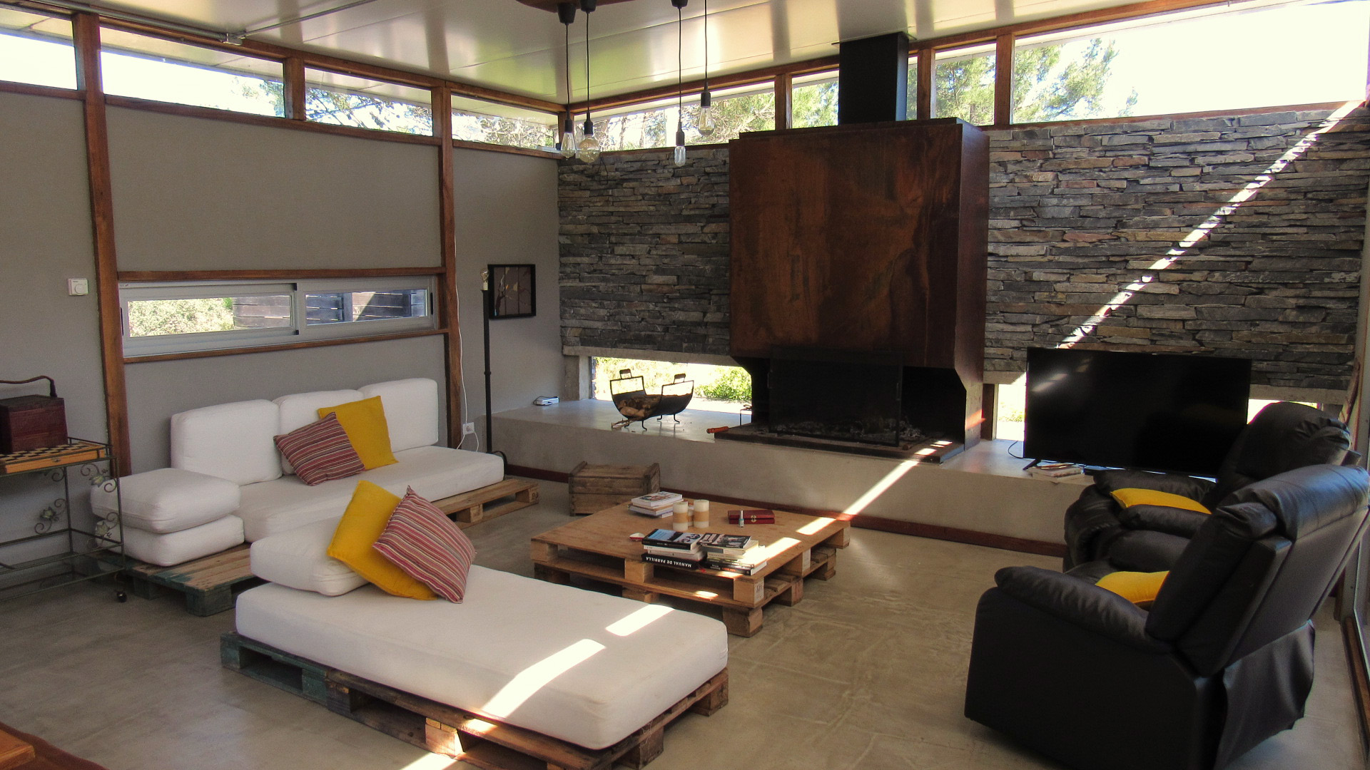 En el módulo principal se ubica el living con sillones que rodean una original estufa a leña. Integrado a éste, el comedor y la cocina, moderna y súper equipada, con una isla-barra en el centro. La transparencia del ambiente logra intergrar el interior al exterior creando una amalgama perfecta. El módulo se completa con el dormitorio principal, con cama doble y baño en suite, y un baño social y despensa.