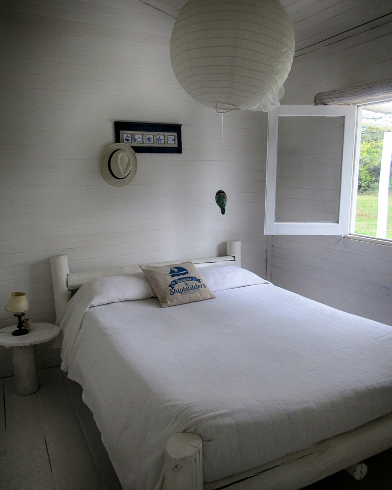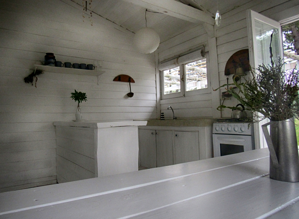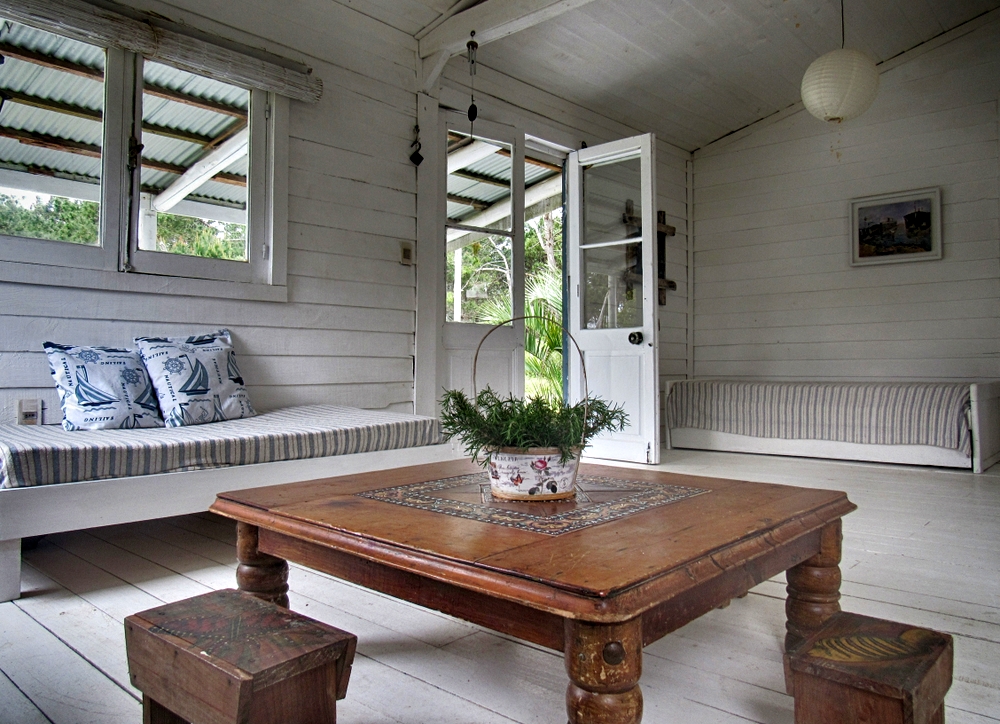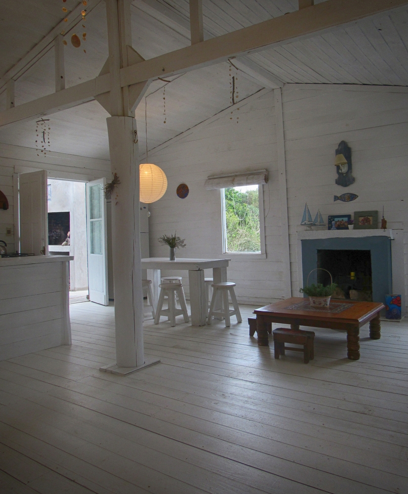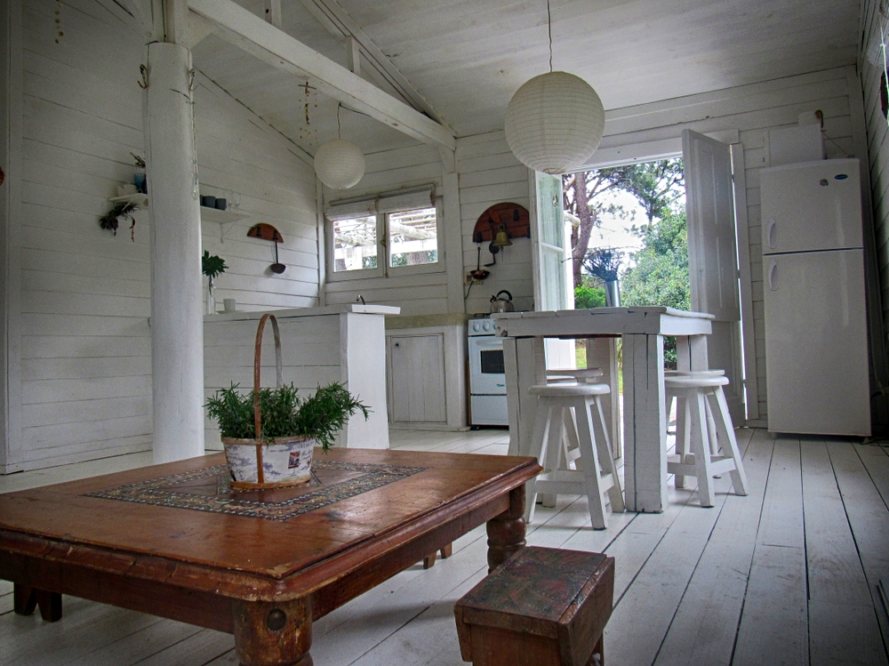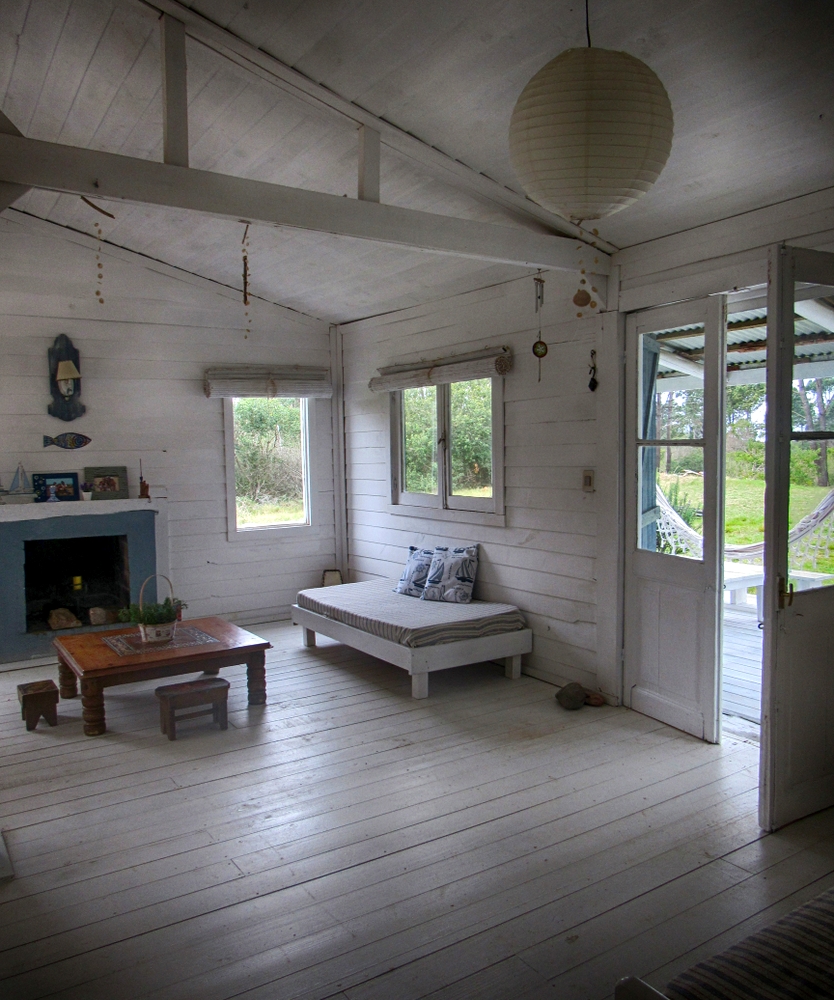 En sus interiores domina el color blanco, aportando una sensación de descanso y expansión de sus ambientes. Con capacidad para 6 personas, ofrece dos dormitorios amplios: uno con cama doble, y otro con dos camas marineras. En el espacioso living comedor se ubica una cocina completa con barra, una mesa con banquetas, una mesa ratona y dos sofá cama alrededor de la estufa a leña.