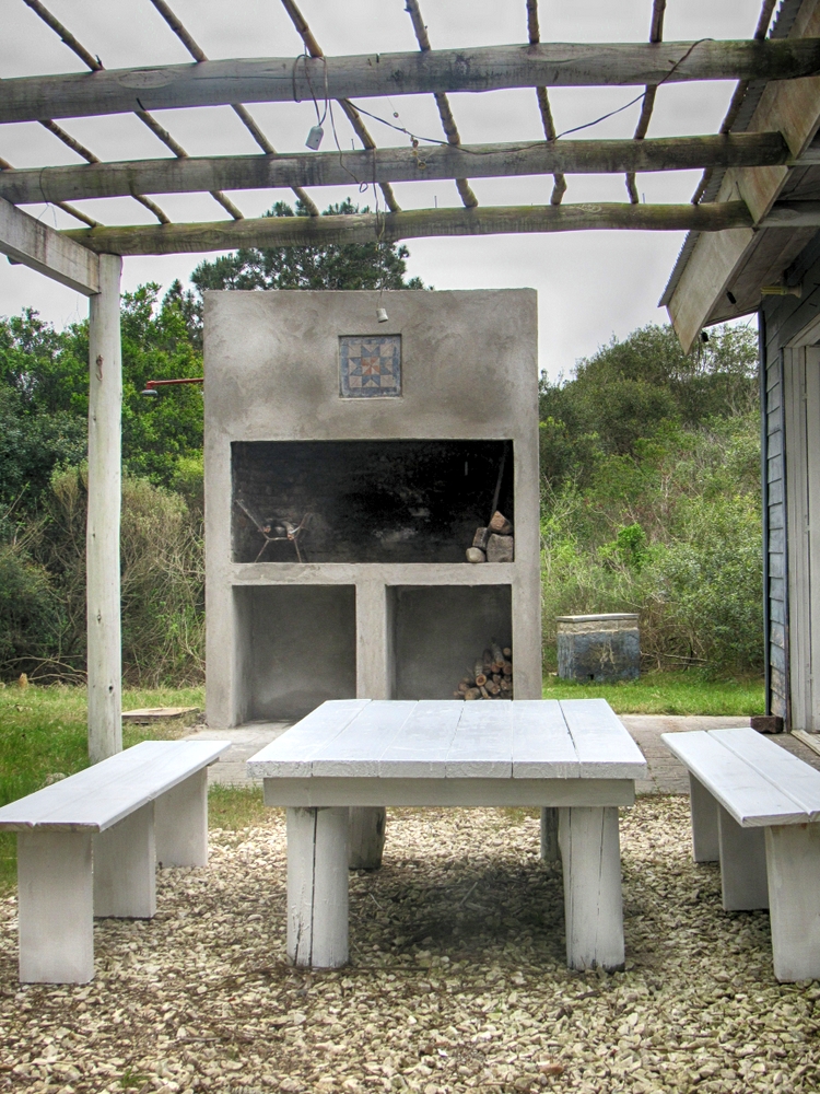 En el exterior, la cabaña ofrece un deck de 20m2 semi-cubierto de cara al mar, con sofá y sillones; y en el fondo, al reparo del Océano, otro deck con mesa y banquetas mirando al parrillero.