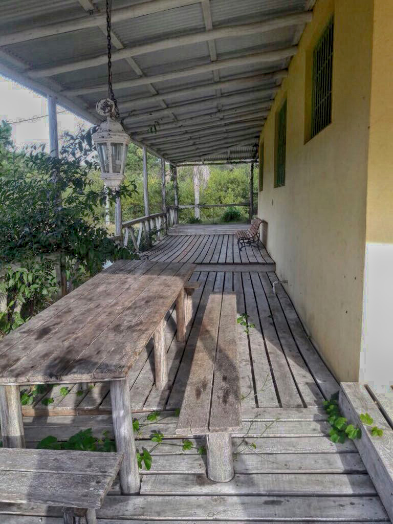 Está rodeada de una gran galería con deck, hamacas y asientos, coronada por una mesa con banquetas al lado del parrillero.
