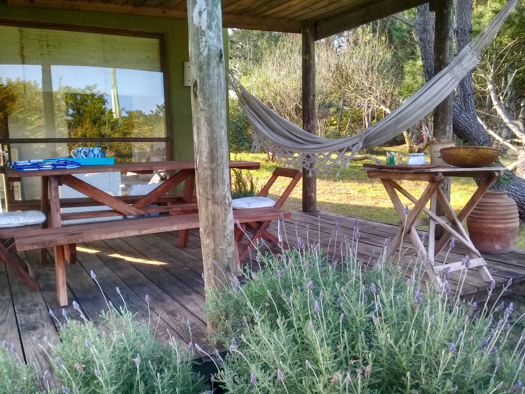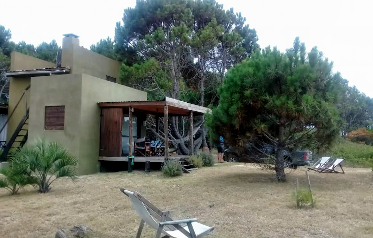 La casita verde ofrece además parrillero completo, sillas y reposeras para generar espacios en el exterior, debajo de grandes pinos, o al reparo de la brisa marina cuando el sol cae.