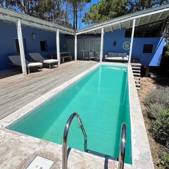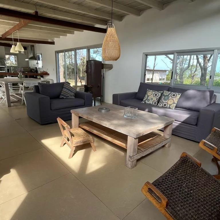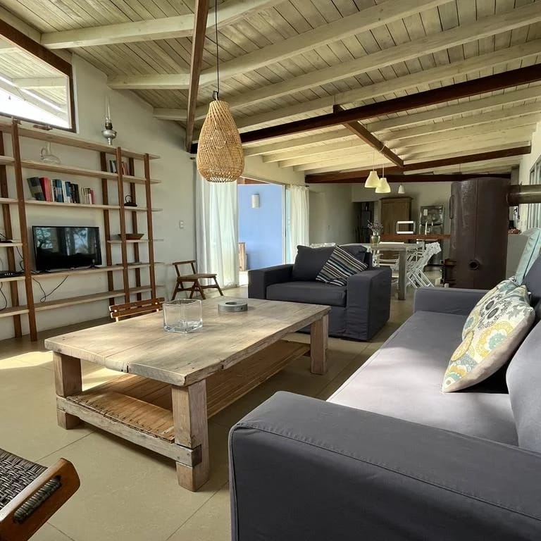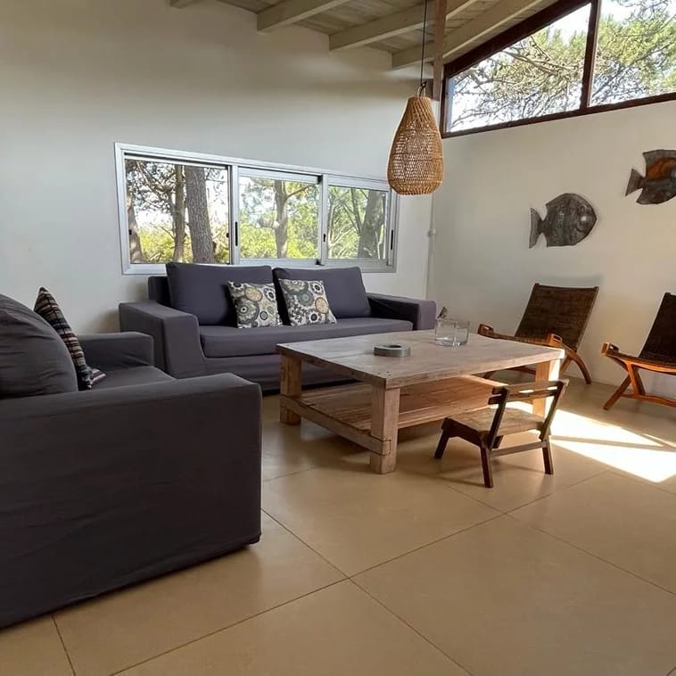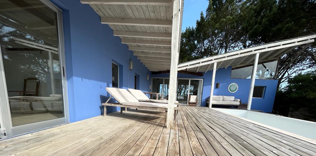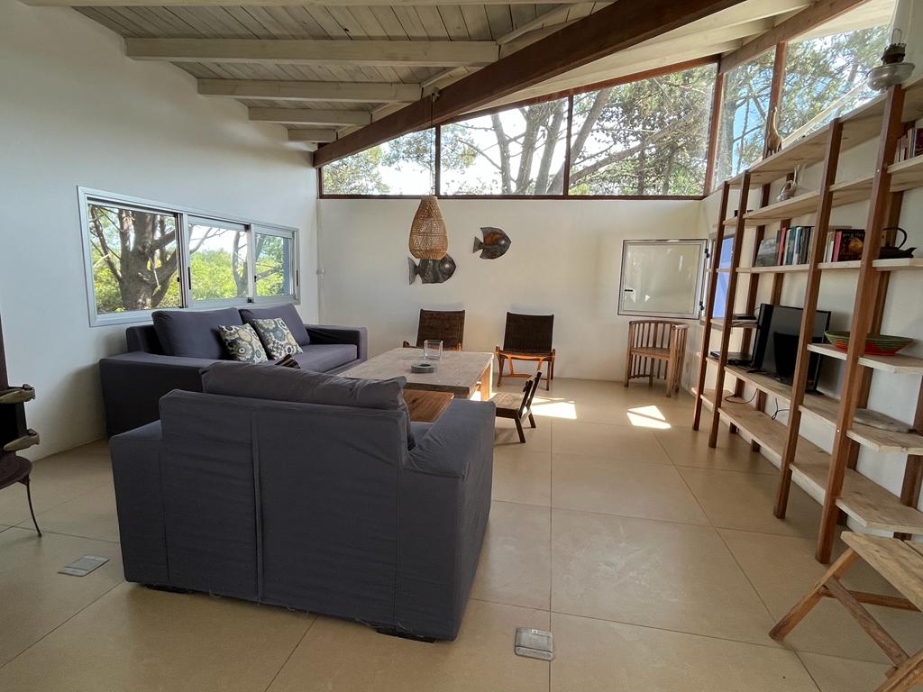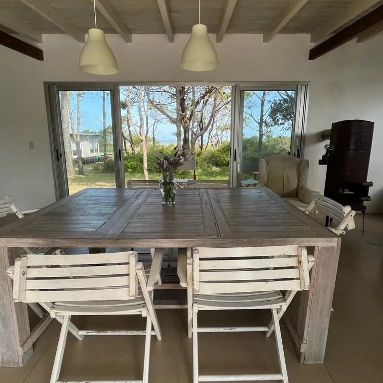 Ubicada entre altos pinos, con vista y a pasos del mar, esta casa de dos plantas ofrece todo lo