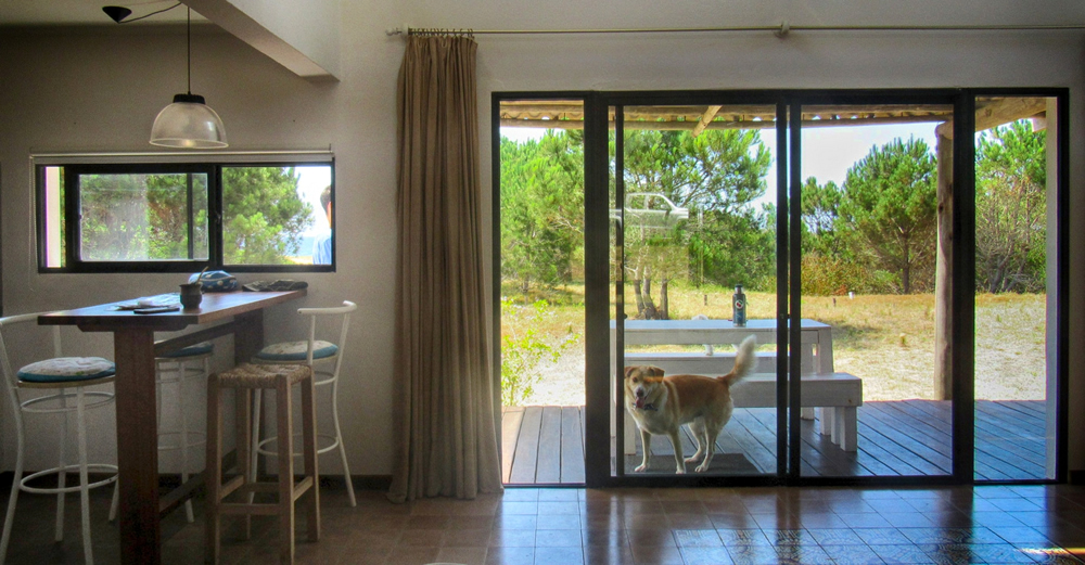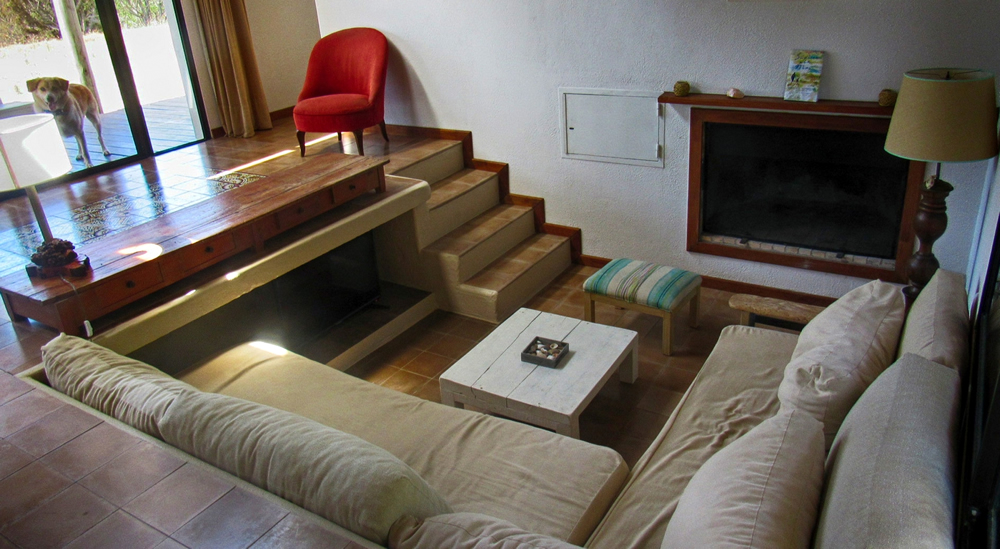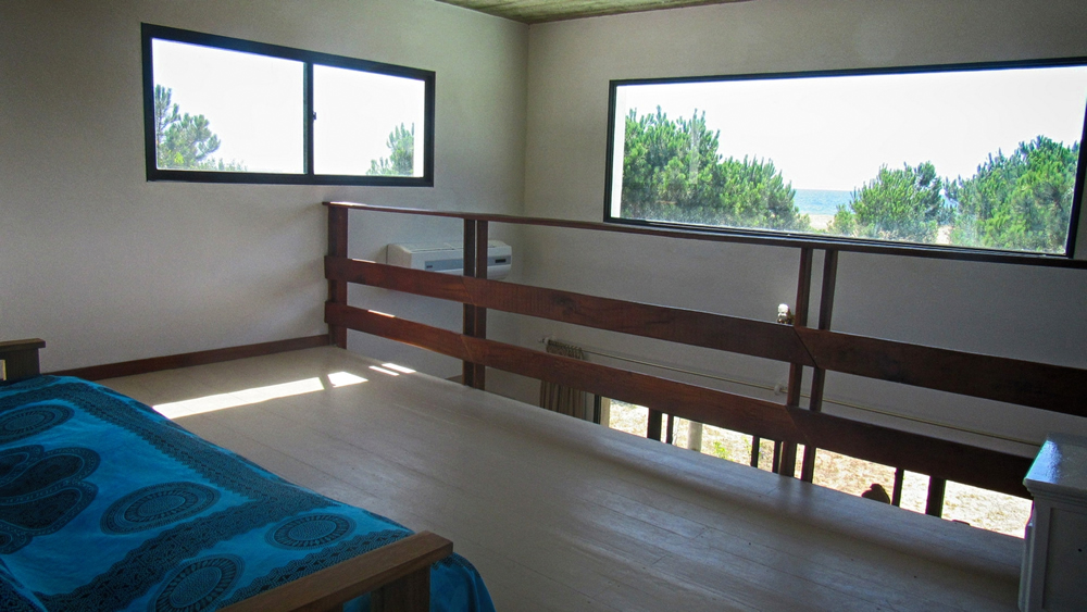 Una barra con banquetas integra cocina con living, que se extiende alrededor de una estufa a leña con cómodos sillones en forma de ele. Una escalera permite llegar hasta un entrepiso, donde se incluye un futón para un evengual quinto huesped y para disfrutar desde la altura la vista franca al Océano.